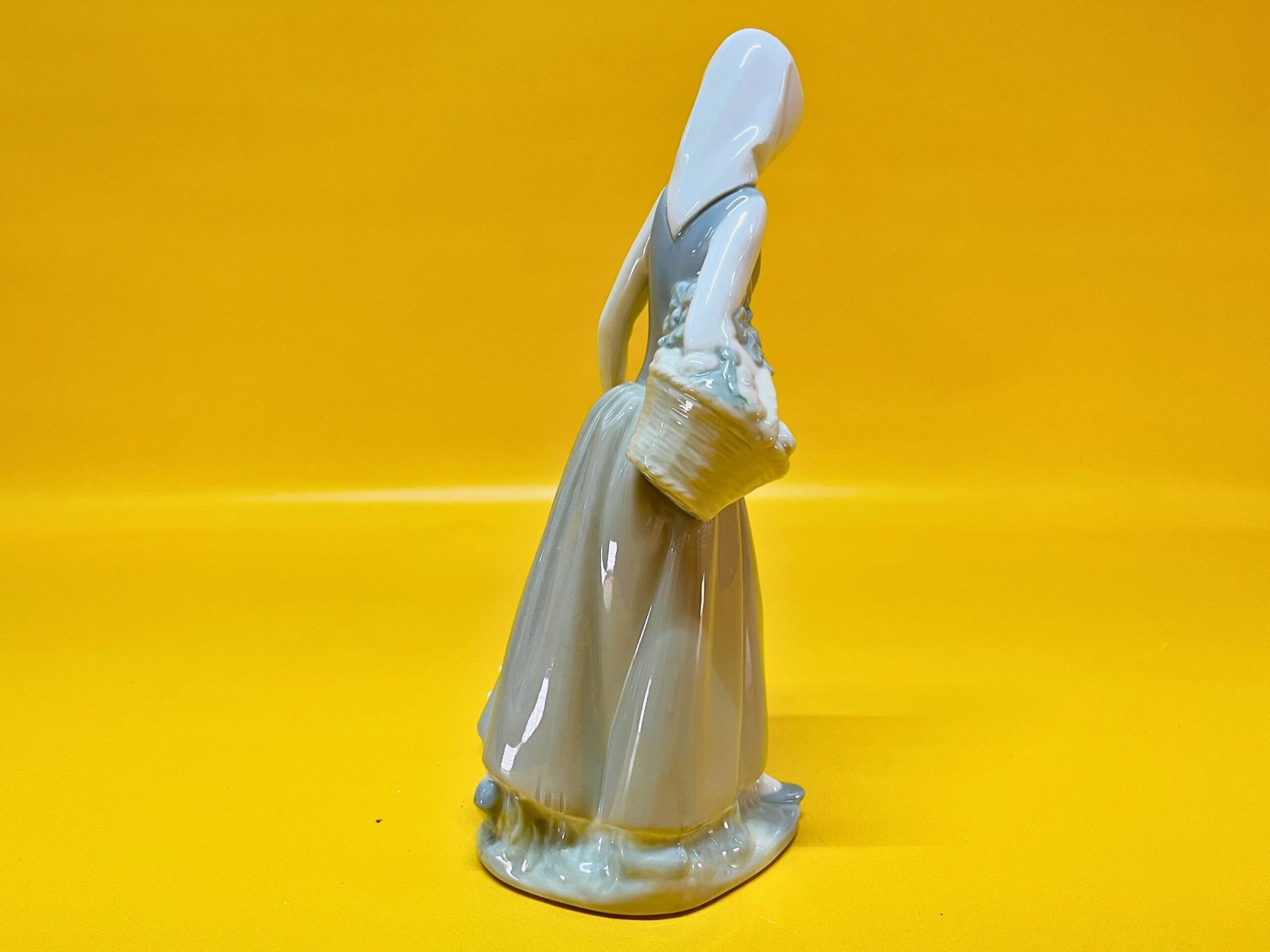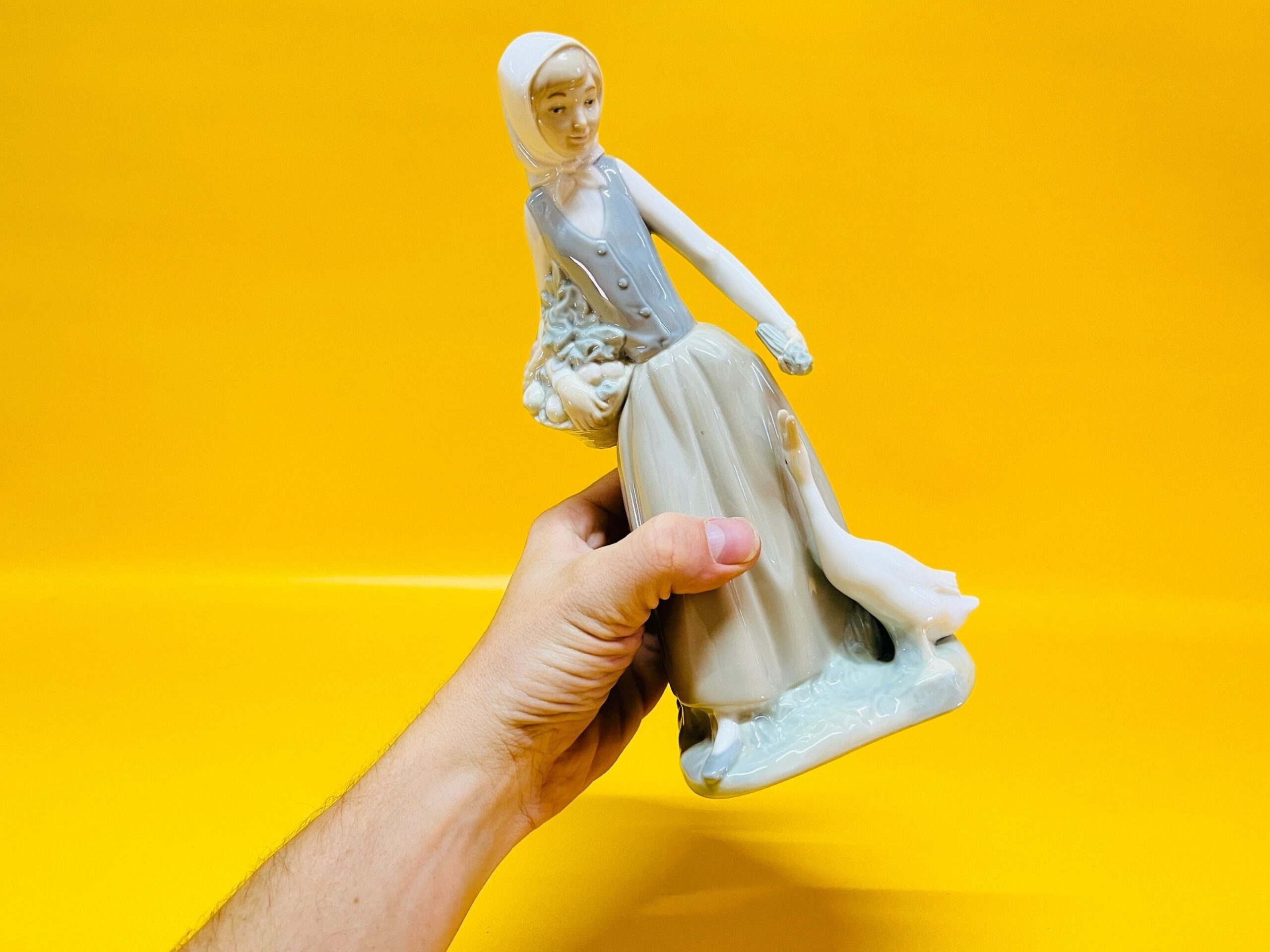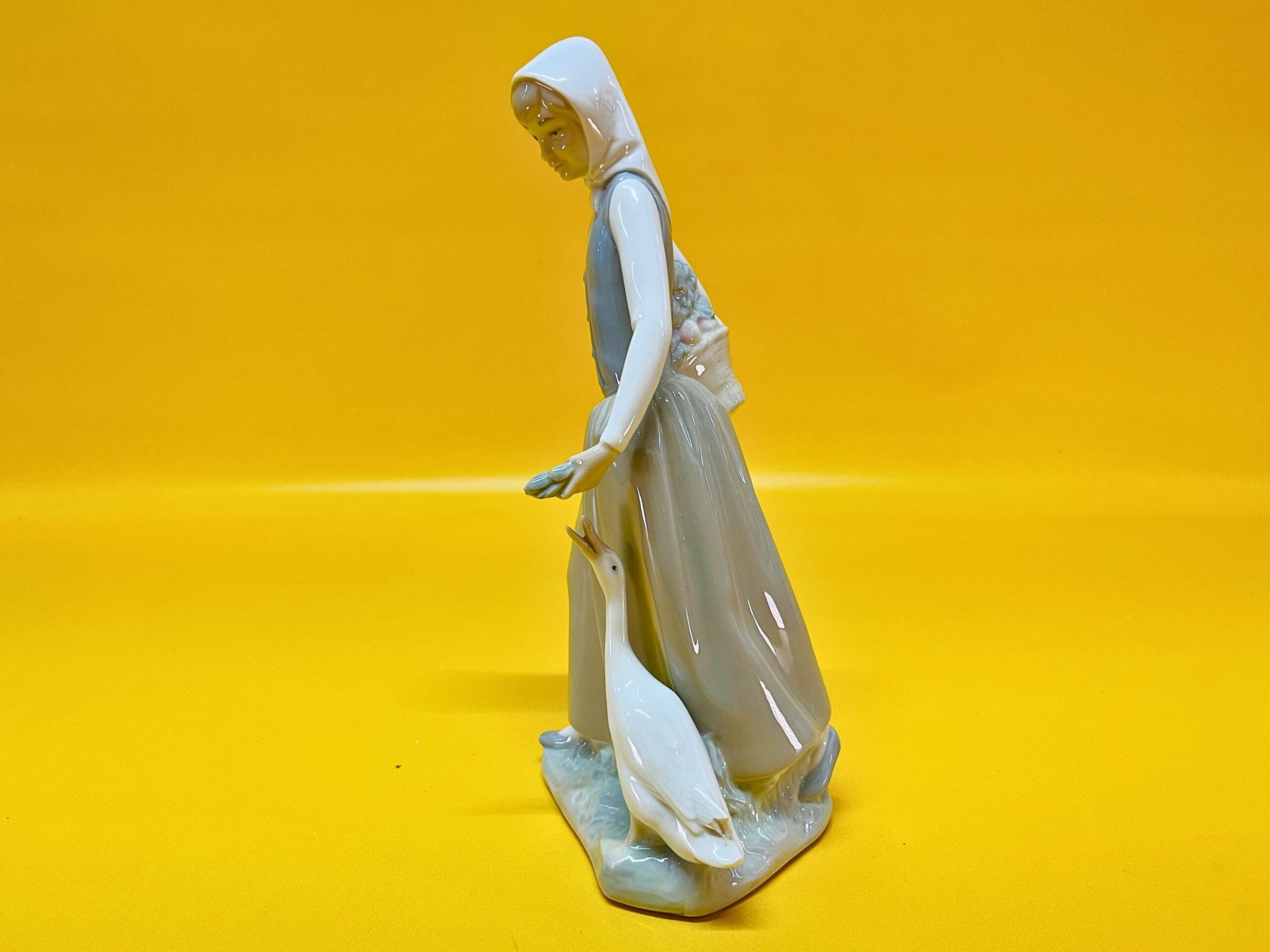 Bring timeless beauty into your home with this delicate porcelain figurine by Nao by Lladro, featuring a woman with a basket and a duck. Crafted in Spain around the 1980s, this piece captures the softness and elegance that have made Lladro creations so beloved among collectors.