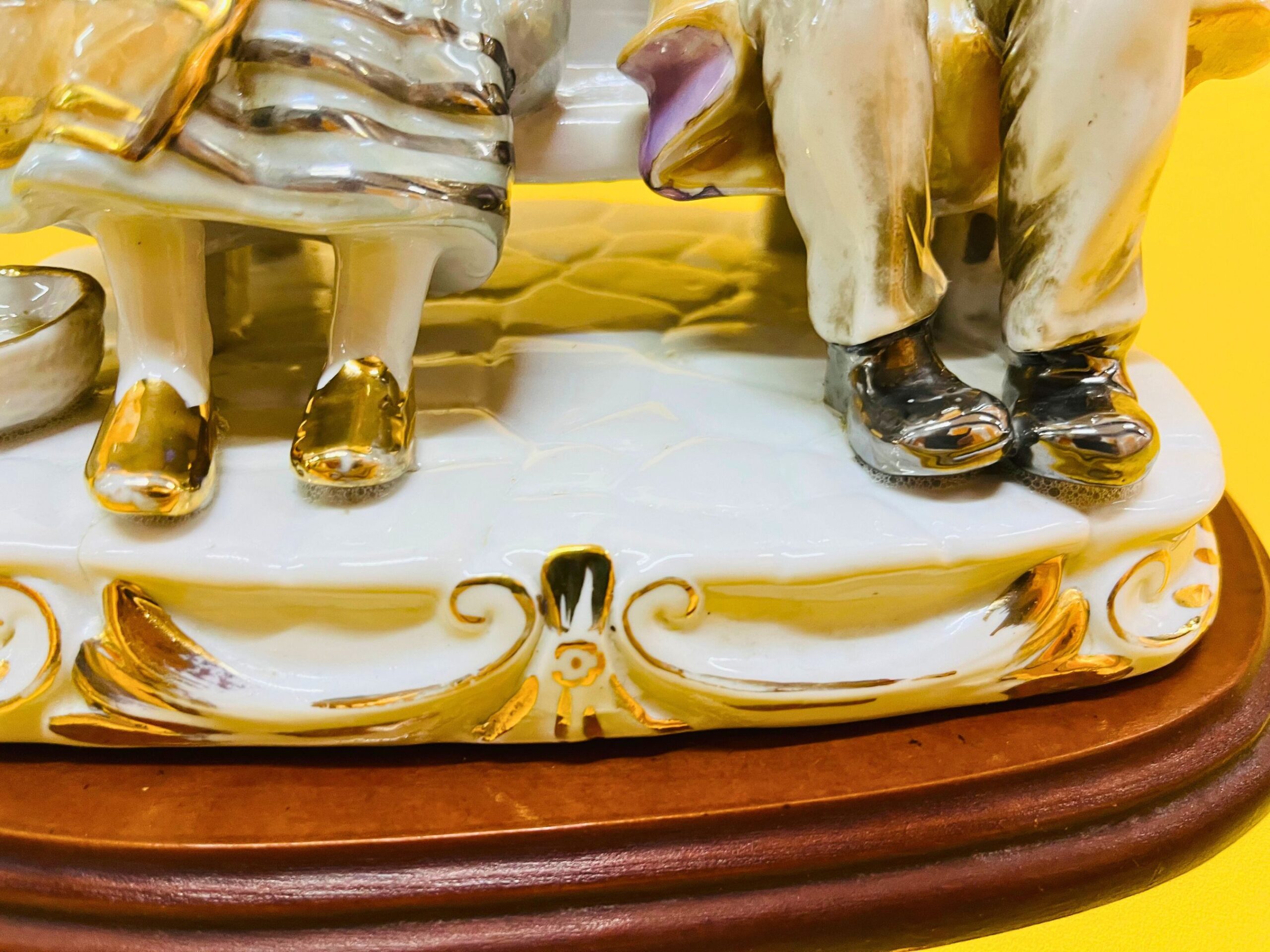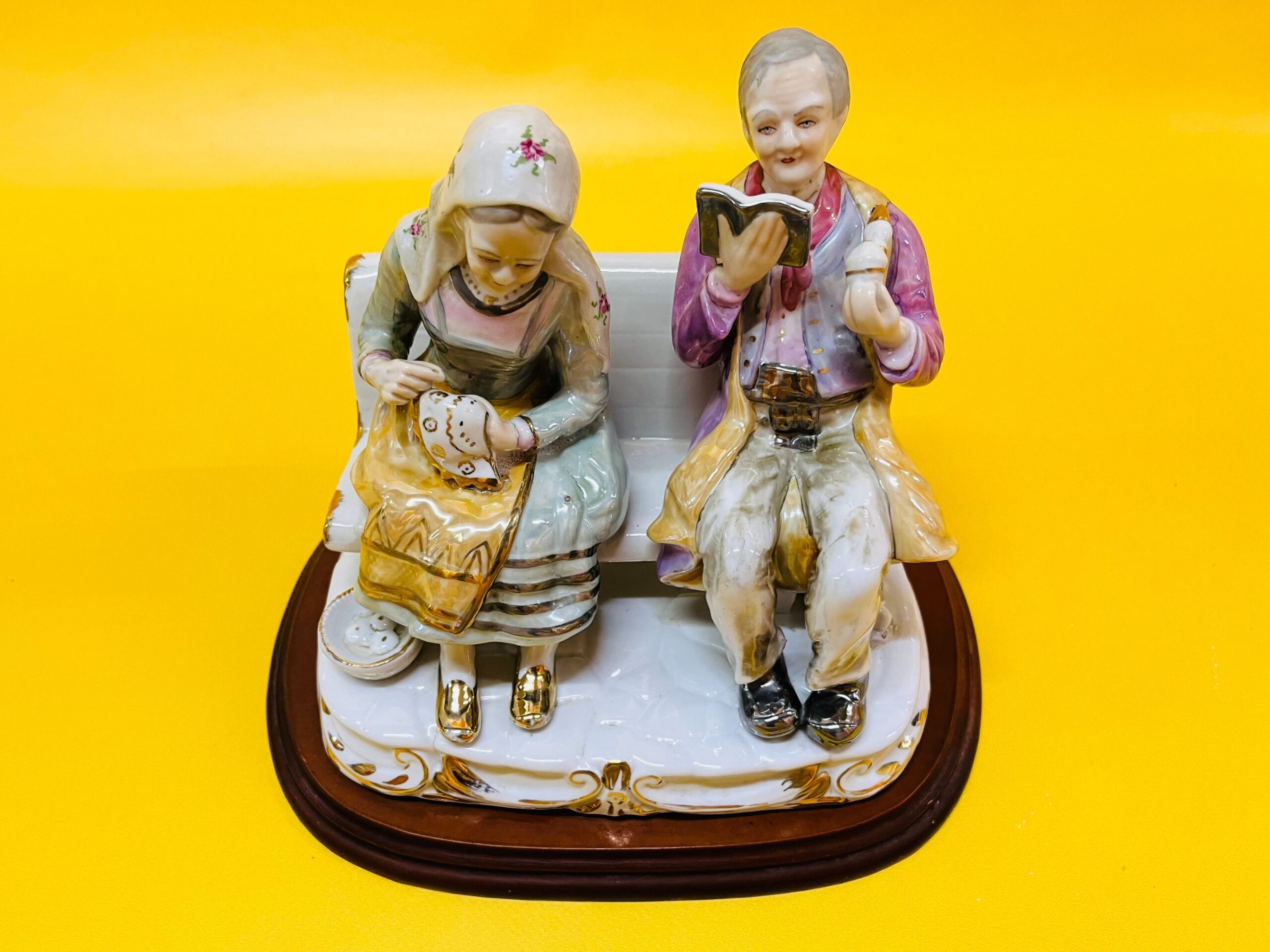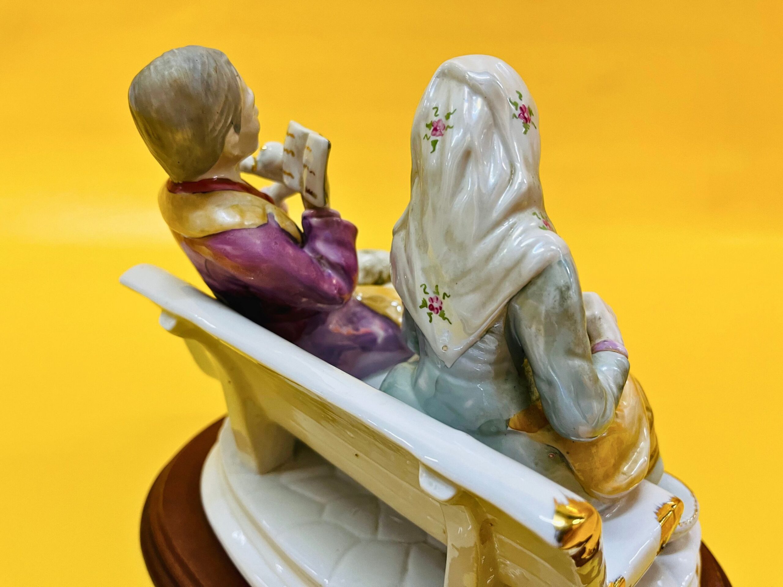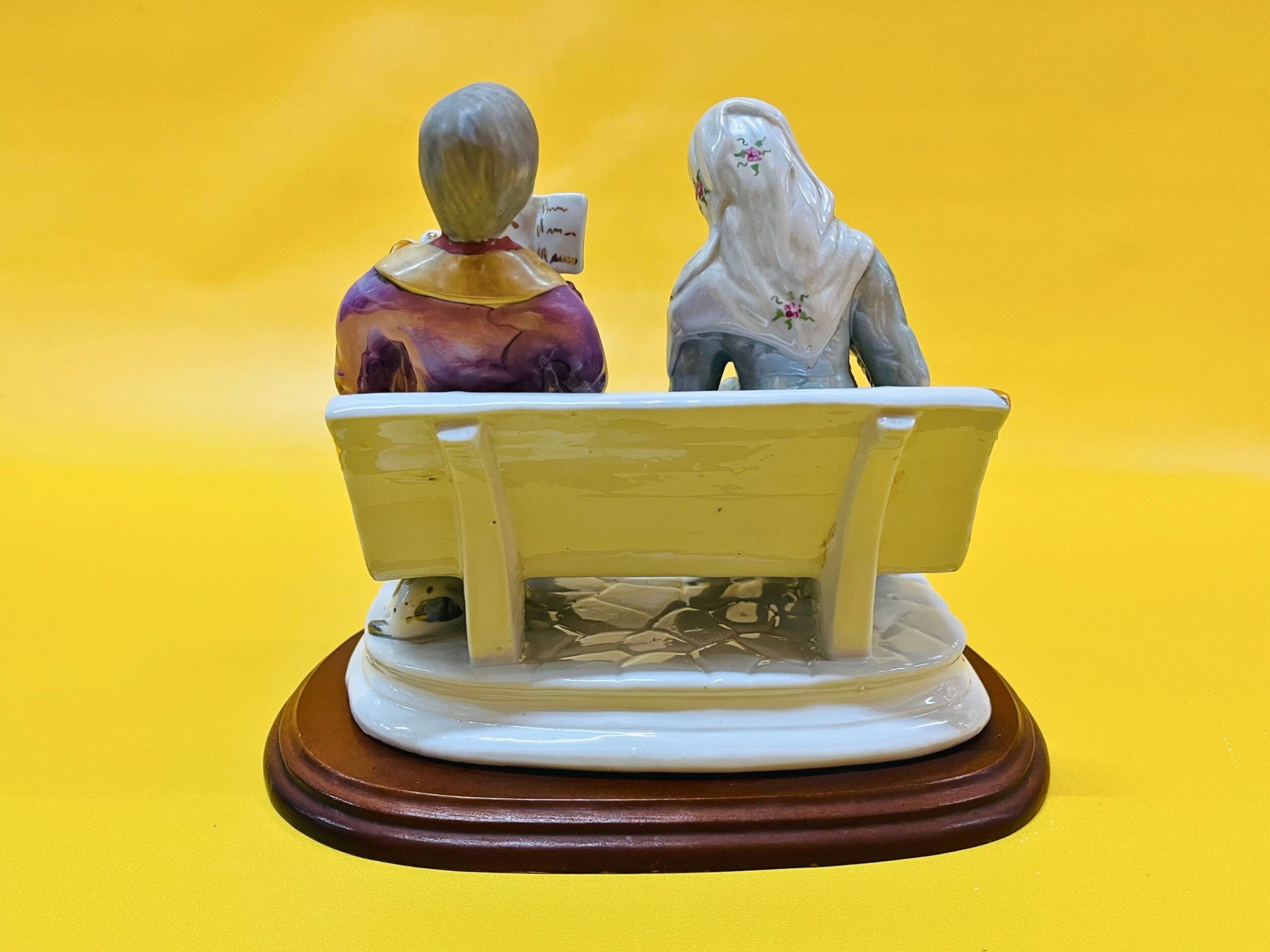 Porcelain figurine of an elderly couple sitting on a bench, beautifully detailed and set on a wooden base. While it resembles the style of Miguel Requena, Made in Spain, I cannot guarantee the maker due to the attached base. However, if you’re interested, the wooden base can be removed upon request to check for markings.
