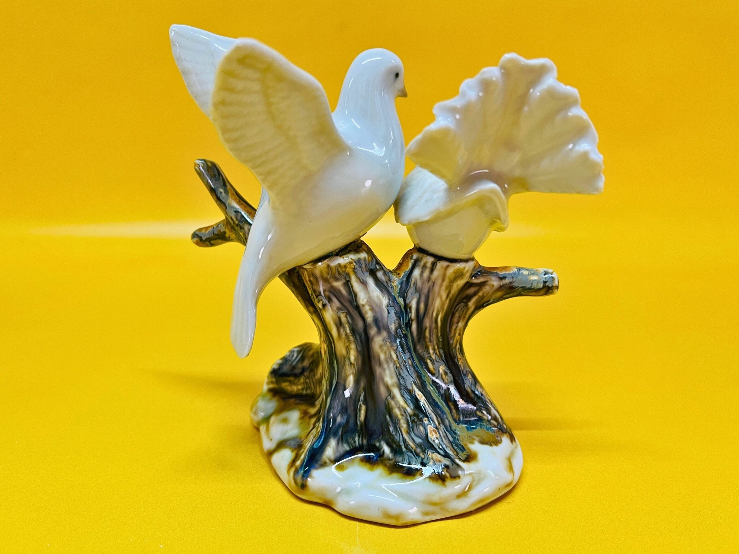 This is a beautiful handcrafted porcelain sculpture depicting two white doves perched lovingly on a tree. Made in Spain, likely during the 1970s or 1980s, by Segarra Porcelain – a brand known for delicate craftsmanship.