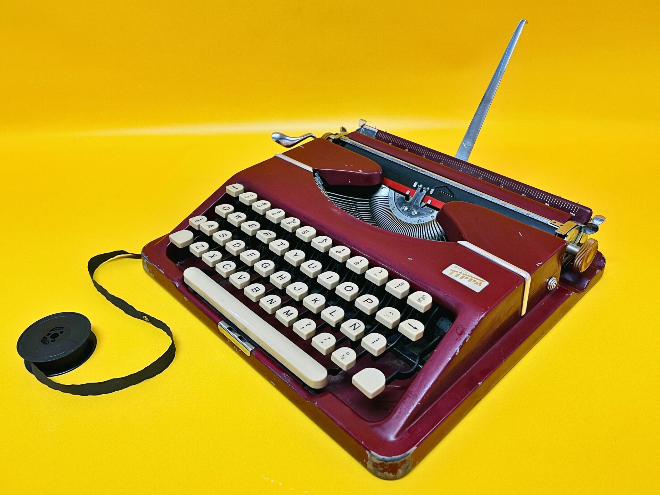 Experience the craftsmanship of German engineering with this Gossen Tippa typewriter. Manufactured in West Germany, this ultra-portable typewriter is lightweight and smooth, making it perfect for writers on the go. The maroon-red color adds a vintage charm, while its reliability makes it both a functional tool and a statement piece.